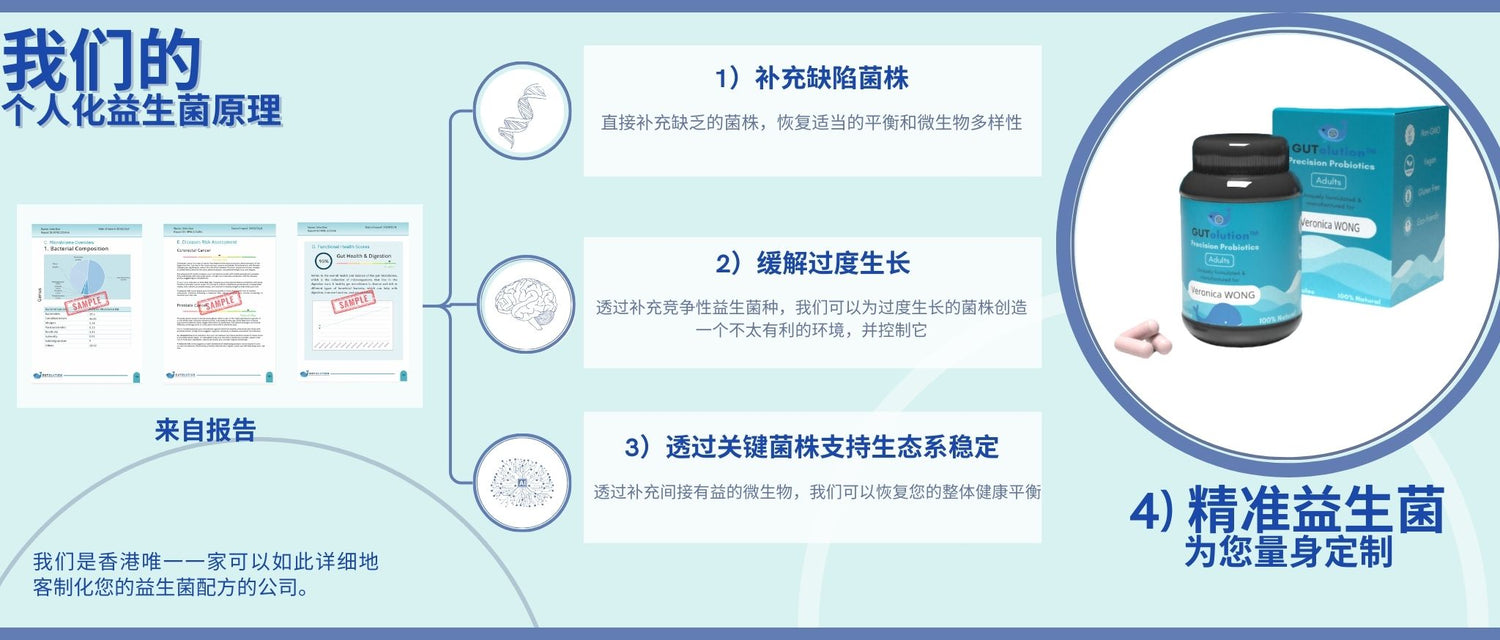 凭借我们的专利 AI 算法和广泛的数据库,GUTolution 能够提供更全面的微生物群检测结果分析。我们生成的报告可以为您提供有关健康的宝贵见解,并建议您可以进行的个性化改善,最终使我们能够制定出针对您特定健康需求的完美益生菌解决方案。