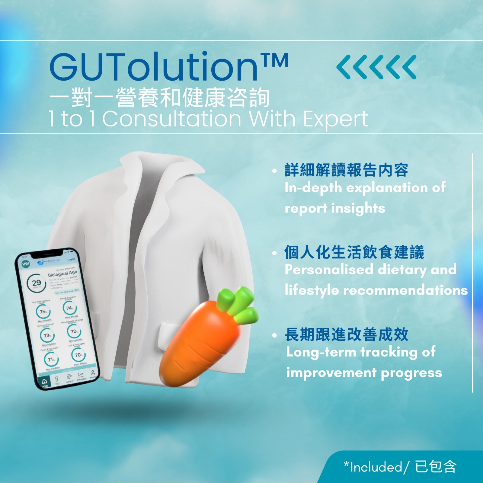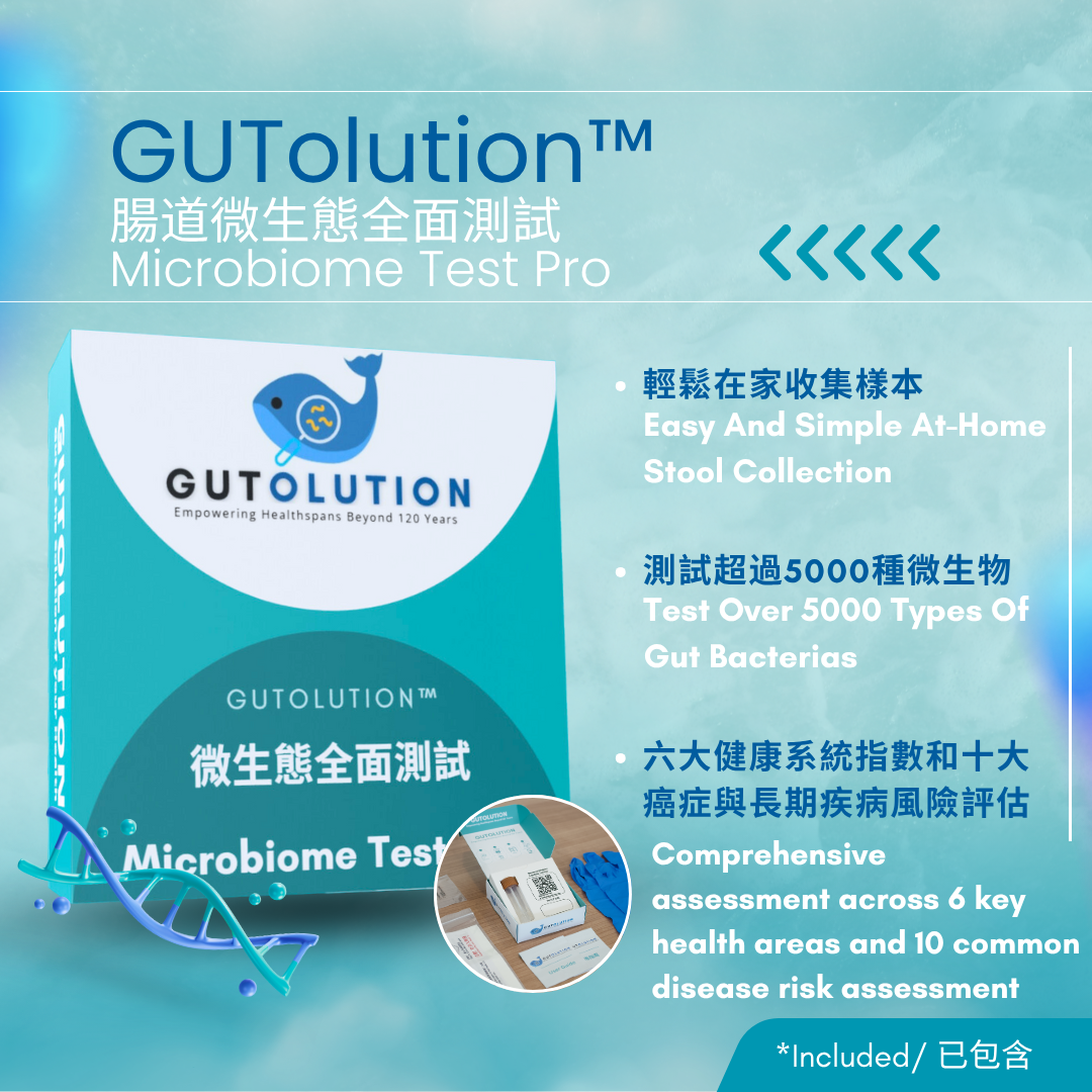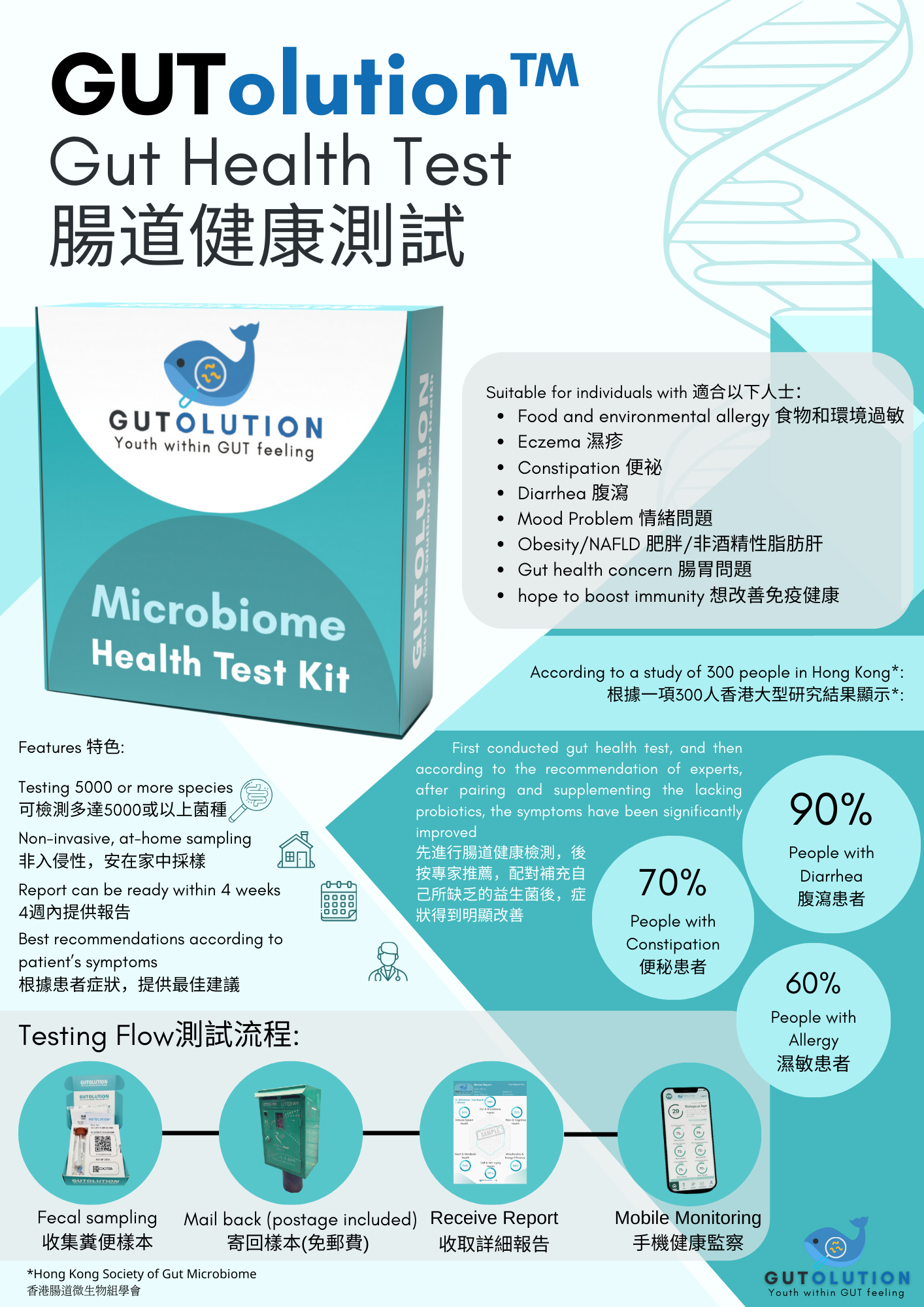 GUTolution微生態全面測試,是一項非侵入性的腸道DNA測試服務。它利用最新的NGS DNA測序技術和人工智能分析,能夠鑒定出超過5,000種不同的菌株。用家只需使用我們的檢測套裝在家收集一份簡單的大便樣本,然後郵寄回給我們,再送到我們在香港的實驗室進行DNA測試。在我們的人工智能模型分析您的微生物組成和潛在健康問題之後,您將獲得一份詳細報告,其中包括各種健康指標和改善建議。