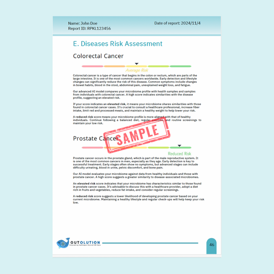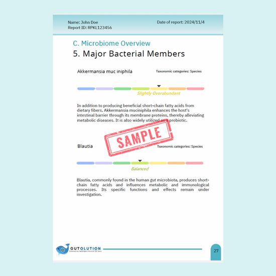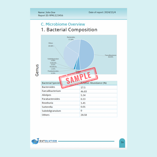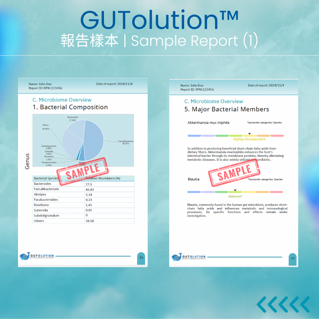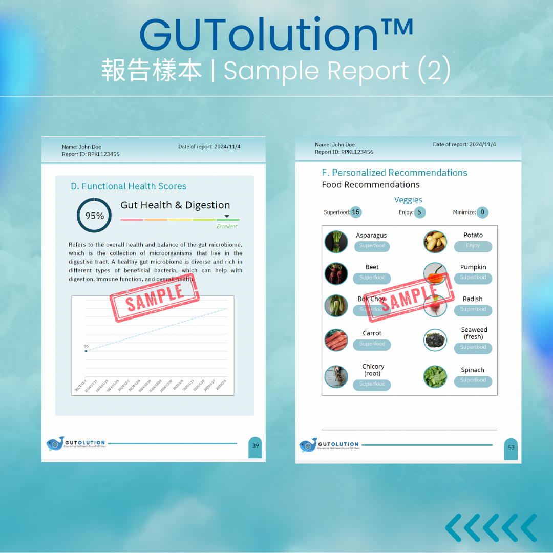 GUTolution微生態全面測試,是一項非侵入性的腸道DNA測試服務。它利用最新的NGS DNA測序技術和人工智能分析,能夠鑒定出超過5,000種不同的菌株。用家只需使用我們的檢測套裝在家收集一份簡單的大便樣本,然後郵寄回給我們,再送到我們在香港的實驗室進行DNA測試。在我們的人工智能模型分析您的微生物組成和潛在健康問題之後,您將獲得一份詳細報告,其中包括各種健康指標和改善建議。